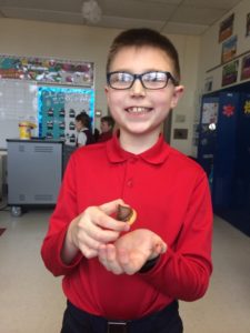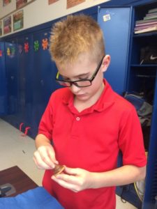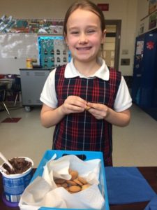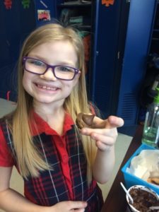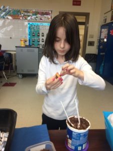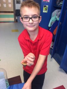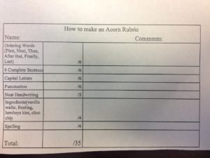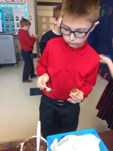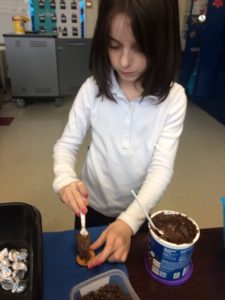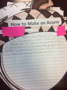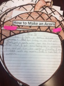 Today in class we decided to take our stories idea and cook something up. Using the knowledge of sequencing words the students created an acorn out of food products. They used a vanilla wafer, a Hersey’s Kiss, a mini chocolate chip, and some frosting. They had a blast making the sweet treat and did a great job writing 6 sentences explaining the steps as to how to create one of these treats.