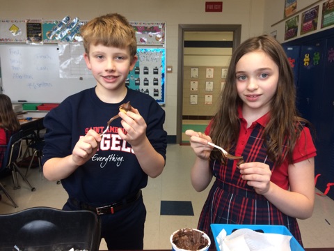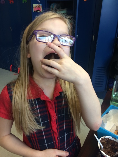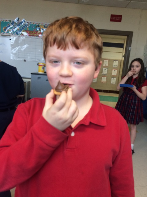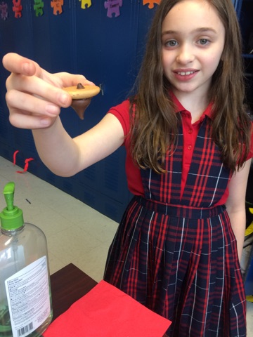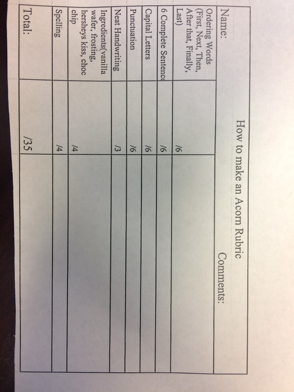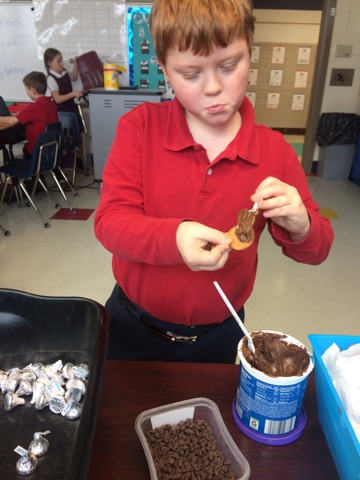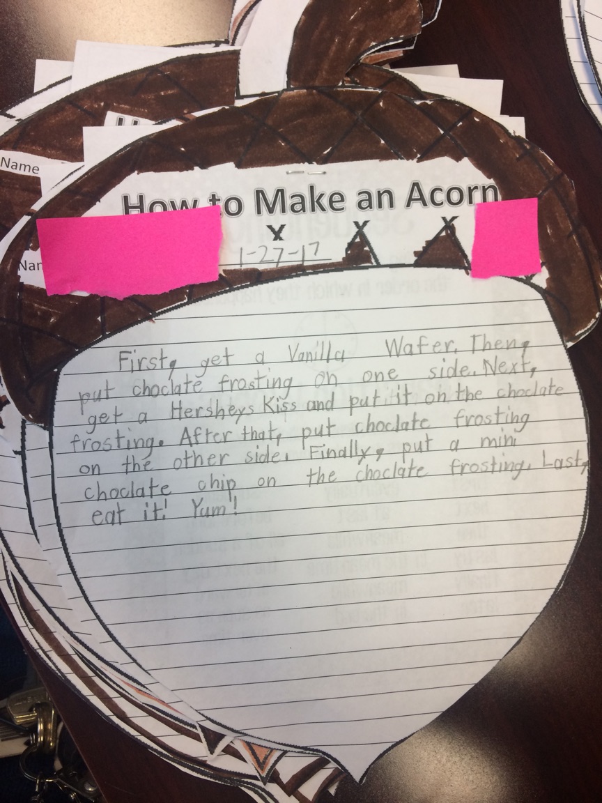 Today in class we decided to take our stories idea and cook something up. Using the knowledge of sequencing words the students created an acorn out of food products. They used a vanilla wafer, a Hersey’s Kiss, a mini chocolate chip, and some frosting. They had a blast making the sweet treat and did a great job writing 6 sentences explaining the steps as to how to create one of these treats.