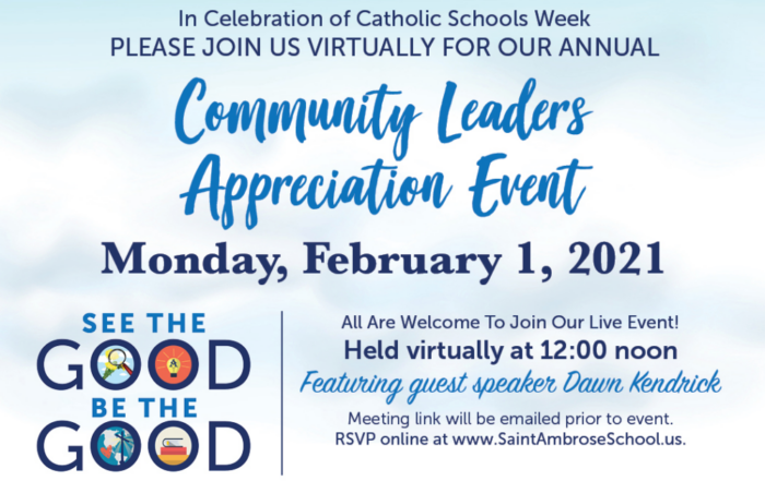 All are invited to join us VIRTUALLY, on Monday, February 1st at noon for an exciting Community Appreciation Event on ZOOM! We are blessed to kick-off Catholic Schools Week with a virtual community leaders...