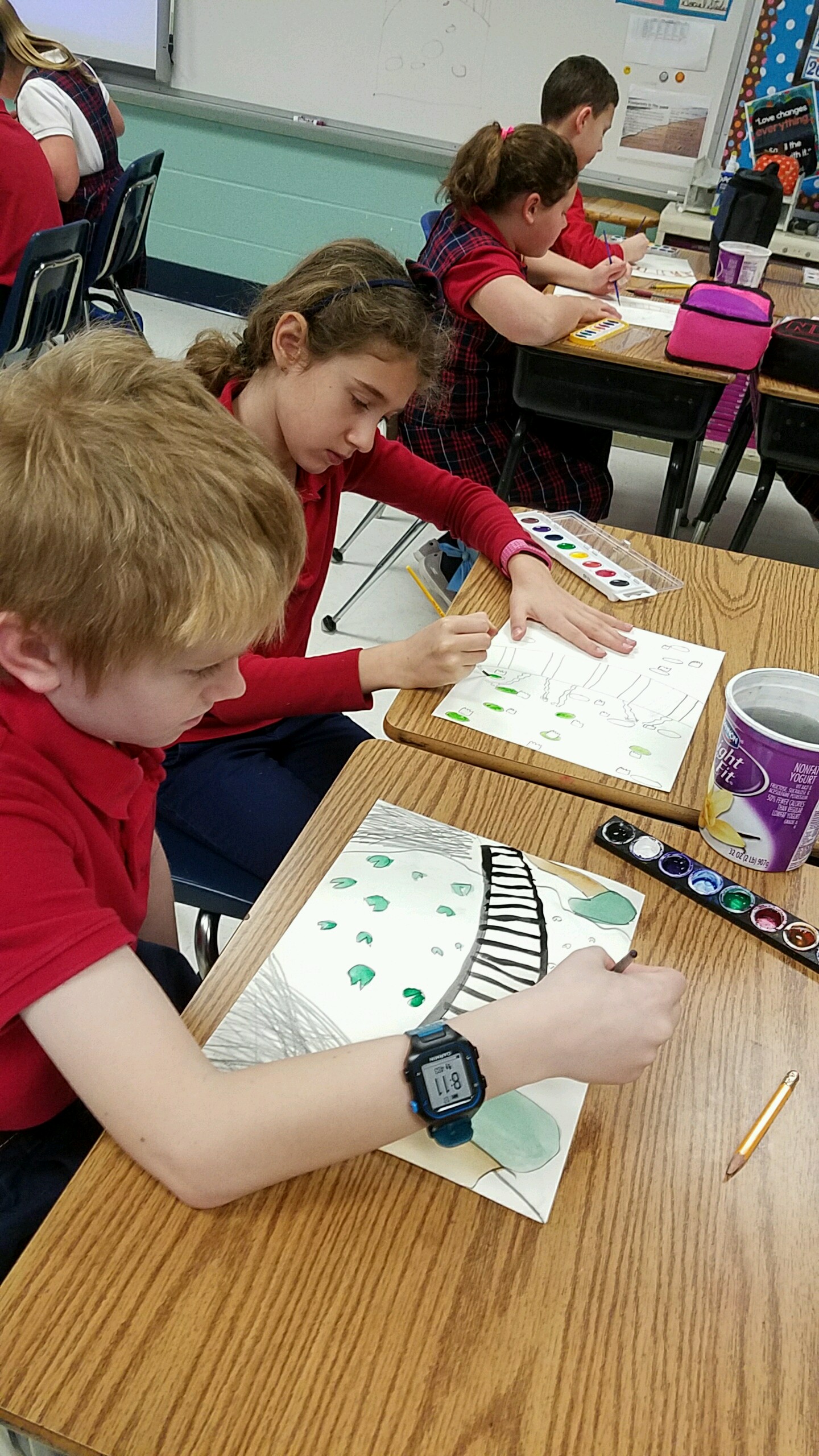 Fourth: Students learned about the “THE MAGICAL GARDEN OF CLAUDE MONET”. They created their own watercolor painting of water lilies. They also learned about the style of impressionism.