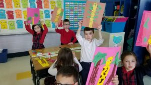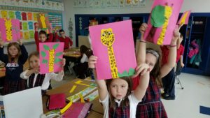 First: Students are in the process of working on a STREAM project. Students observed the live footage of “April” the giraffe in the Animal Adventure Park in New York.They developed collage of a giraffe in it’s natural habitat.